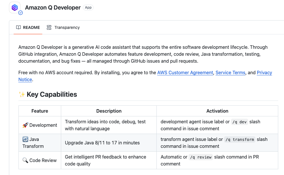 - Visit the Github Marketplace in Applications and install Amazon Q Developer.